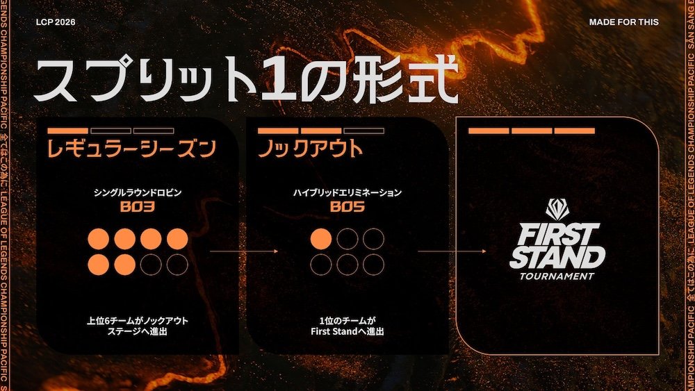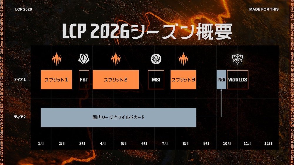 「LCP」は、アジア太平洋地域のLoL Esports競技シーンにおける最高峰リーグ。2026年からは3つのスプリットに分けられ、それぞれの直後に国際大会が設定されている。