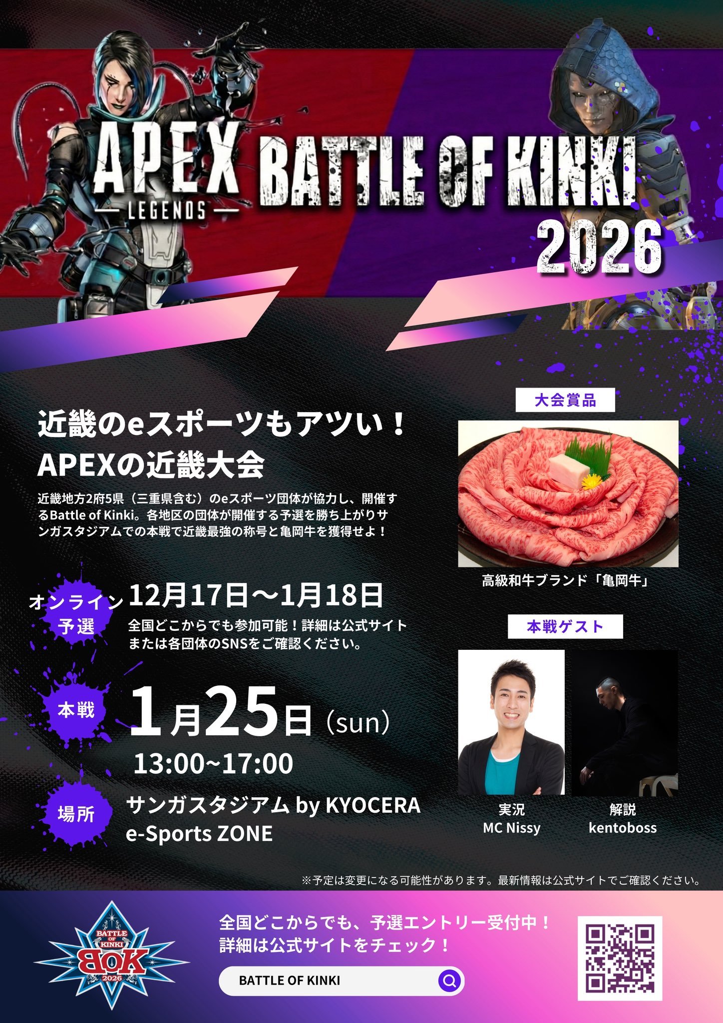 関西2府5県(京都・大阪・滋賀・三重・兵庫・奈良・和歌山)の各団体からなる関西eスポーツ実行委員会による『Apex Legends』の大会。各府県ごとのオンライン予選を経て、サンガスタジアム by KYOCERA e-Sports ZONEにて1月25日(日)に本戦が行われる。予選形式や詳細ルールは各予選大会の案内を確認。