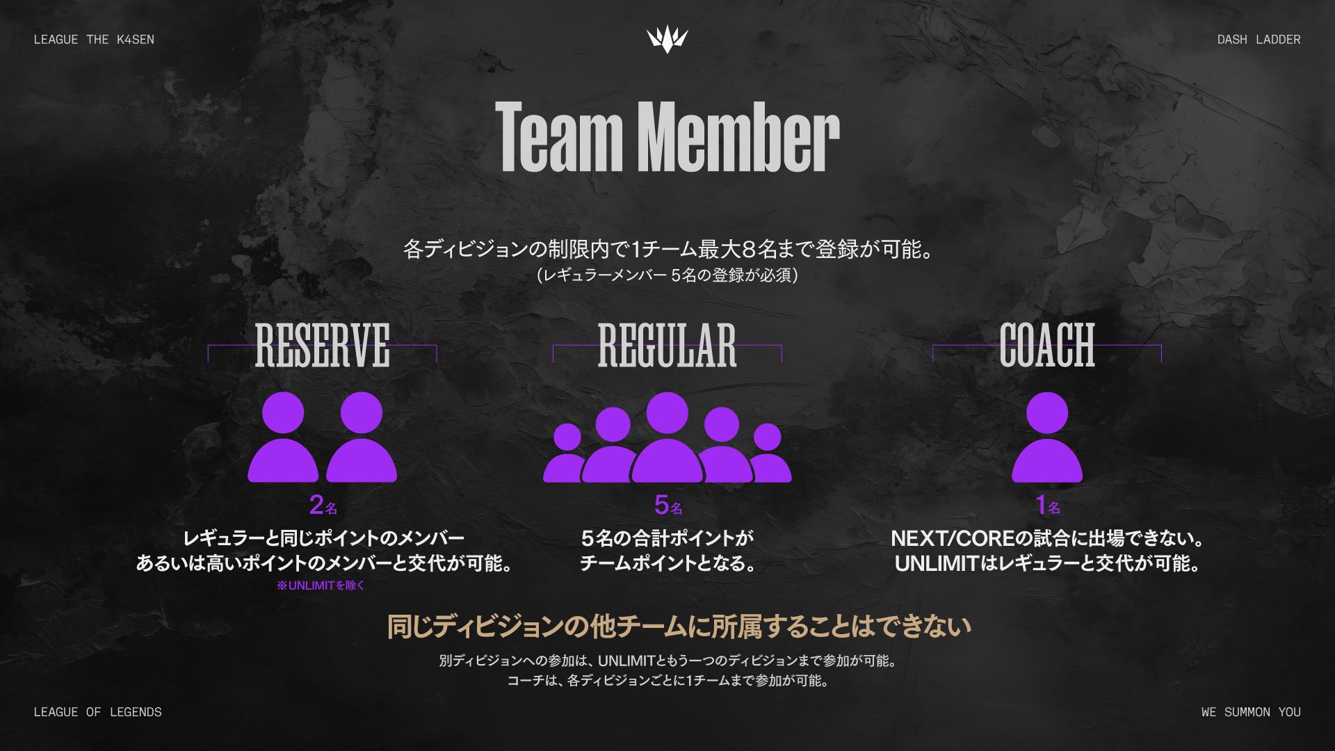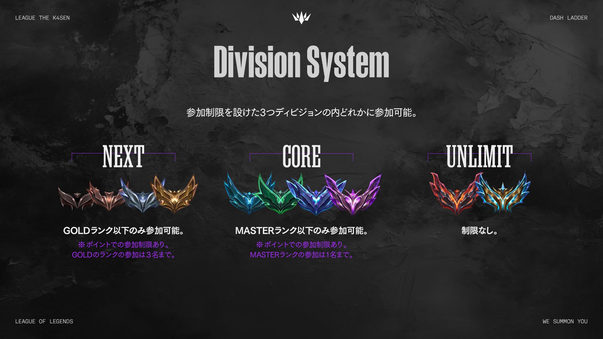 今回の「League The k4sen: DASH LADDER」は誰でも参加可能な大会だが、制限を設けた3つのディビジョン(NEXT / CORE / UNLIMIT)を採用しており、ポイントやランク制限を超えないようメンバーを組む必要がある。募集期間は3月30日(月)〜4月6日(月)23:59。