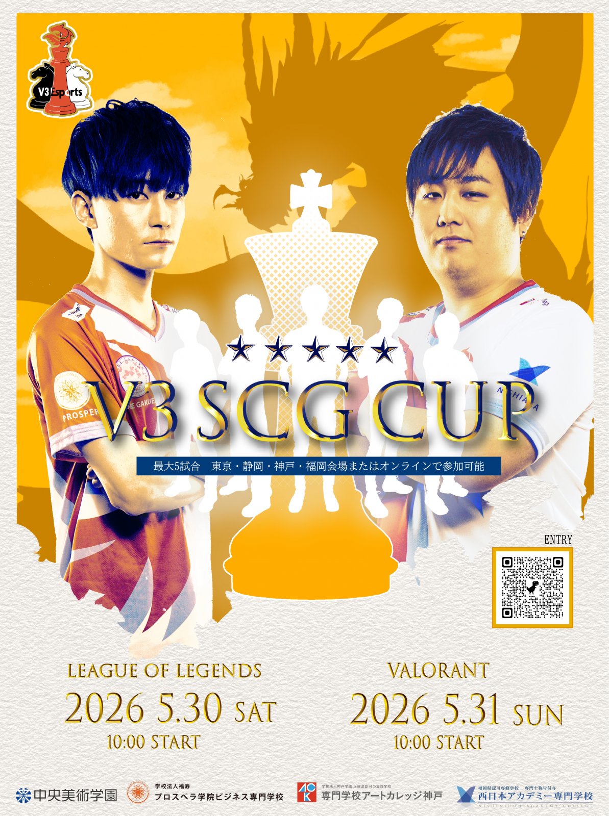 - 大会概要 【ゲームタイトル】リーグ・オブ・レジェンドVALORANT【概要】 「V3 SCG CUP」は、将来のプロ選手発掘を目的とした高校生向けeスポーツ大会。タイトルは『リーグ・オブ・レジェンド』、『VALORANT』の2部門。学校法人神戸学園が運営するプロeスポーツチームV3Esportsが主催し、全国の高校生プレイヤーを対象にトーナメント形式にて最大5回の選考(試合)を行う。参加はチーム・個人どちらでも応募可能。【フォーマット】 ・各タイトル最大40チーム(200名)・レベル別2部門構成(各最大20チーム)のトーナメント形式・全試合シングルエリミネーション、BO1(1本先取) ・最低2試合実施、初戦敗退チームはエキシビションマッチあり会場 【会場】 オンライン / オフライン併用オフライン専門学校アートカレッジ神戸(兵庫県神戸市東灘区向洋町中1-15)西日本アカデミー専門学校(福岡県福岡市中央区渡辺通5-14-10)東京会場(東京都中央区日本橋堀留町1-9−8人形町PREX10F)静岡会場(静岡県静岡市駿河区曲金6-4-6)日程 【日程】リーグ・オブ・レジェンド部門:2026年5月30日(土)10:00~ VALORANT部門:2026年5月31日(日)10:00~エントリー情報 【エントリー条件】2026年4月時点で日本国内に在住する高校生・定時制高校生・高等専門学校生(3年生まで)・通信制高等学校生であること※文部科学省が定める大学入学資格の条件に該当する学校に所属していること(例) 全日制高校、定時制高校、多部制高校、単位制高校、通制高校、高等専門学校、高等専修学校、専門学校高等課程、インターナショナルスクール※日本在住の外国人留学生も参加可能【エントリー〆切】 2026年5月22日(金)17:00 ※エントリー数が上限に達した時点で申し込み終了の場合あり【エントリーURL】https://t.co/nn37rCKDzDリンク 【リンク】V3Esports公式HP:https://v3esports.com/V3Esports公式X:https://twitter.com/V3EsportsJP