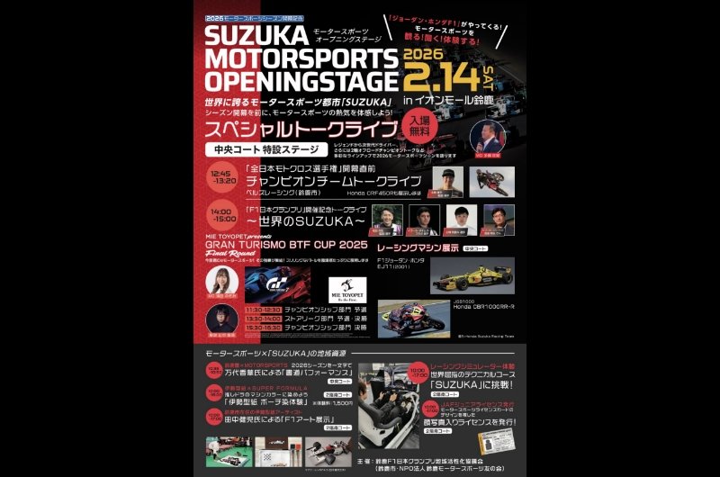 - 大会概要 【ゲームタイトル】グランツーリスモ7【概要】 『グランツーリスモ7』の三重県最速ドライバーを決める大会。競技レベルの高い「チャンピオンシップ部門」と、未経験者から経験者まで参加できる「ストアリーグ部門」があり、2025年11月〜2026年1月まで予選を開催。決勝大会がオフラインで「SUZUKA MOTORSPORTS OPENING STAGE 2026」(in イオンモール鈴鹿)内で実施される。なお、「SUZUKA MOTORSPORTS OPENING STAGE 2026」は、世界に誇るモータースポーツ都市「SUZUKA」をテーマに、トークライブ、展示・体験企画などを通じてモータースポーツを“観る・聞く・体験する”総合イベント。【フォーマット】チャンピオンシップ部門:予選/決勝ストアリーグ部門:予選・決勝【プログラム】スペシャルトークライブ(中央コート 特設ステージ)12:45〜13:20:「全日本モトクロス選手権」開幕直前 チャンピオンチームトークライブ14:00〜15:00:「F1日本グランプリ」開催記念トークライブ 〜世界のSUZUKA〜レーシングマシン展示(中央コート)F1ジョーダン・ホンダ EJ11(2001)JSB1000 Honda CBR1000RR-Rレーシングシミュレーター体験(2階 南コート)10:00〜17:00:世界屈指のテクニカルコース「SUZUKA」に挑戦JAFジュニアライセンス発行(2階 南コート)10:00〜17:00:顔写真入りライセンス発行地域連携・文化企画10:35〜10:50:鈴鹿墨 × MOTORSPORTS万代香華氏による「書道パフォーマンス」(中央コート)10:00〜16:00:伊勢型紙 × SUPER FORMULA「伊勢型紙 ポーチ染体験」(2階 南コート)体験料:1,500円10:00〜17:00:鈴鹿市在住の伊勢型紙アーティスト田中健児氏による「F1アート展示」(2階 南コート)会場 【会場】 イオンモール鈴鹿【住所】三重県鈴鹿市庄野羽山4丁目1-2日程 【日程】 2026年2月14日(土)【タイムスケジュール】 11:30〜12:30 チャンピオンシップ部門 予選 13:30〜14:00 ストアリーグ部門 予選・決勝 15:30〜16:30 チャンピオンシップ部門 決勝出演者 MC:清田 のぞみ 解説:山中 智瑛チケット情報 【チケット種類】入場無料リンク 鈴鹿F1日本グランプリ地域活性化協議会 X:https://x.com/suzuka212121