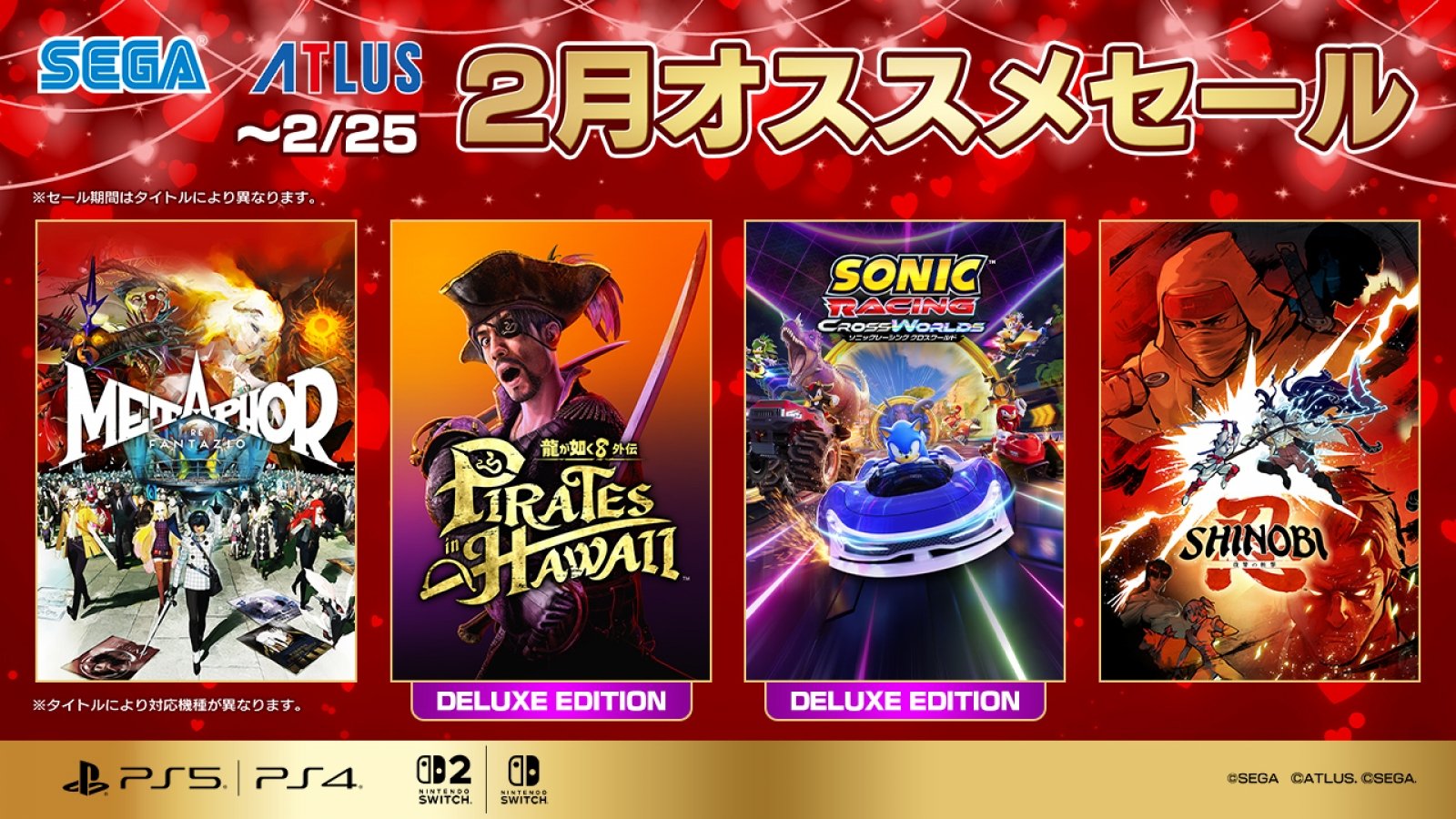 セガ+アトラスの人気タイトルがお得に買える「セガ 2月オススメセール」が開催中。真島吾朗が主役の『龍が如く8外伝 Pirates in Hawaii』が72%OFFとなるほか、シリーズ関連作が対象となっている。また、競技シーンでも採用される『ぷよぷよeスポーツ』が770円(税込)の特別価格で販売中だ。期間は2026年2月25日(水)まで(Switch版は24日まで)。<以下、ニュースリリースより>『龍が如く8外伝 Pirates in Hawaii』『ソニックレーシング クロスワールド』がセールに登場! 株式会社セガは、PlayStation™Storeおよびニンテンドーeショップにて販売中の一部PlayStation®5/PlayStation®4/Nintendo Switch™/Nintendo Switch™ 2用タイトルを対象とし、期間限定で特別価格にて販売する「セガ 2月オススメセール」を開催中です。 セガから、かつて最凶の極道と恐れられた真島吾朗が失った記憶と財宝を求め大海原を巡る『龍が如く8外伝 Pirates in Hawaii』デラックス・エディションが72%オフ、ソニックシリーズだけでなく、人気のコラボキャラクターがレースに参戦する『ソニックレーシング クロスワールド』デジタルデラックスエディションが40%オフでセールに登場します。 また、Metacriticユーザースコア8.6を記録し、全世界で高評価を獲得している新作忍者アクション『SHINOBI 復讐の斬撃』が40%オフでラインアップされます。 アトラスから、『ペルソナ3』『ペルソナ4』『ペルソナ5』クリエイターをはじめ、一流アーティストが参画した完全新作ファンタジーRPG『メタファー:リファンタジオ』が50%オフで登場します。 セール終了日は、2026年2月25日(水)となります。 セール対象タイトル、割引率については特設サイトをご確認ください。「ダウンロード版セール特設サイト」https://www.sega.jp/special/sale/■PS5®/PS4®『龍が如く8外伝 Pirates in Hawaii』デラックス・エディション ©SEGA■PS5®/PS4®/Nintendo Switch™『ソニックレーシング クロスワールド』デジタルデラックスエディション ※ニンテンドーeショップでの販売は、2月24日(火)までとなります。 ©SEGA © Crypton Future Media, INC. www.piapro.net ©ATLUS. ©SEGA. TM & © Mojang AB. © 2025 Viacom International Inc. All Rights Reserved. Nickelodeon, SpongeBob SquarePants and all related titles, logos and characters are trademarks of Viacom International Inc. SpongeBob SquarePants created by Stephen Hillenburg. PAC-MAN™& ©Bandai Namco Entertainment Inc. ©CAPCOM■PS5®/PS4®/Nintendo Switch™『SHINOBI 復讐の斬撃』※ニンテンドーeショップでの販売は、2月24日(火)までとなります。 ©SEGA■PS5®/PS4®『メタファー:リファンタジオ』 ©ATLUS. ©SEGA.ストアやタイトルごとに販売時期や価格が異なることがあります。また、タイトル販売価格がセール価格になっているか、ご購入時に必ずご確認をお願いいたします。 ■記載されている会社名、製品名は、各社の登録商標または商標です。